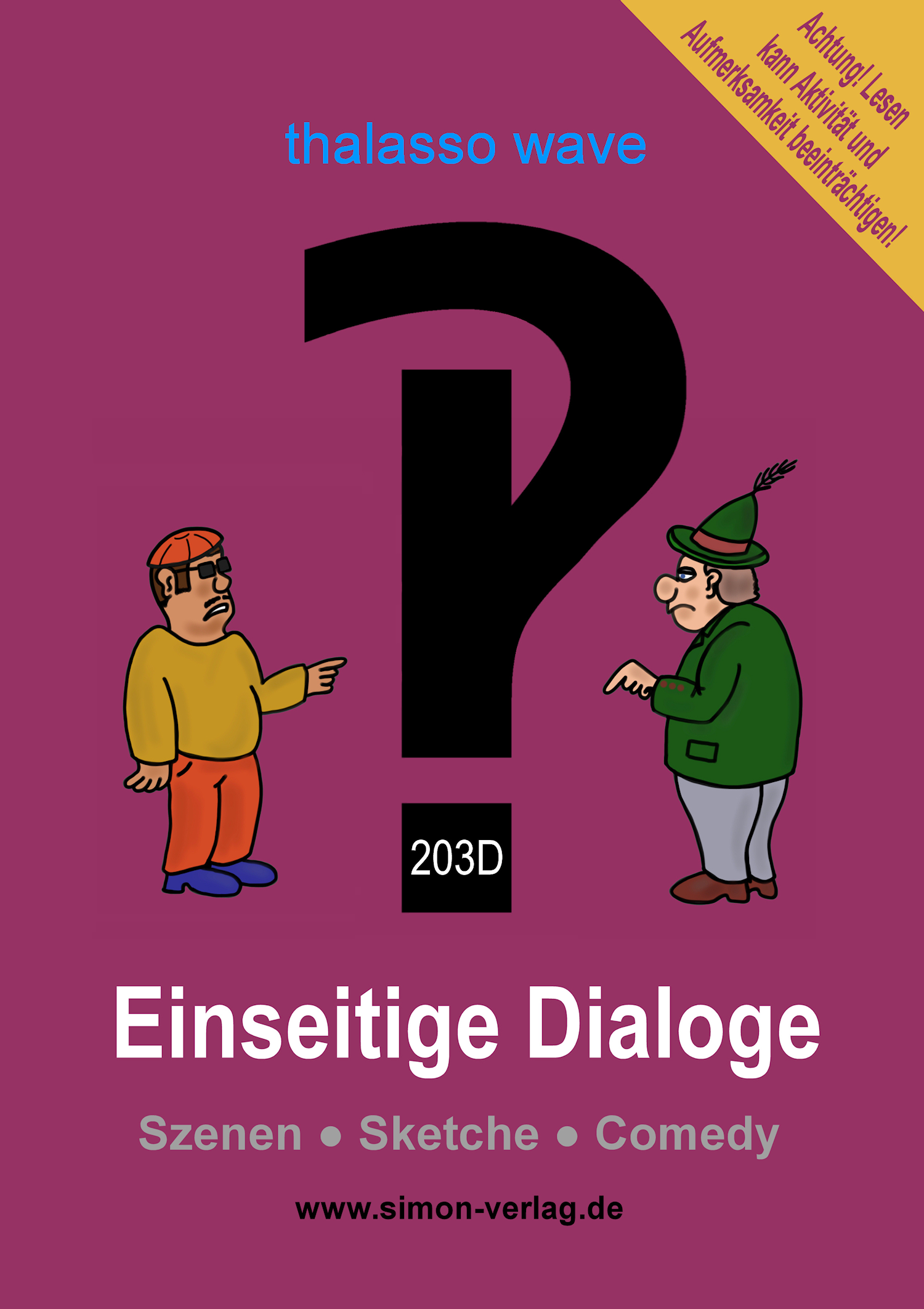 thalasso wave Einseitige Dialoge‽ Szenen • Sketche • Comedy Ironische, wahre, satirische, erfundene, sarkastische, übertriebene, zielführende, dramatische, wirkliche, unsinnlose, fanatische, tierische, traumhafte, wissenschaftliche, virtuelle, freundliche, konkurrierende, senile, verstörende, finale, durchgeistigte, serviceorientierte, anthroposophe, proaktive, krasse, geschmackvolle, philosophische, unglaubhafte, sündige, menschliche, überflüssige, traumatische, zweifelhafte, treffende, zahnlose, persönliche, unscharfe, parallele, begeisterte, kosmische, vermeidbare, seelenlose, bedeutende, blöde, phantastische, zweideutige, perfide, nutzlose, verschnörkelte, nutzlose, esoterische, verblüffende, schamlose, sinnliche, hilfesuchende, erfüllende, mystische und eben einseitige Dialoge aus dem wirklichen und unwirklichen Leben.